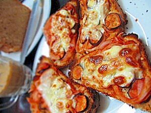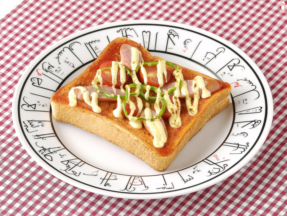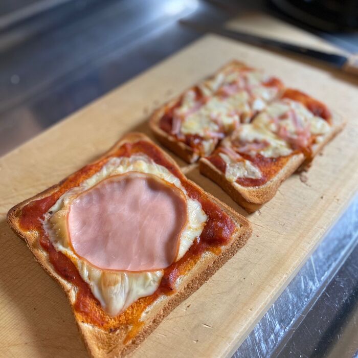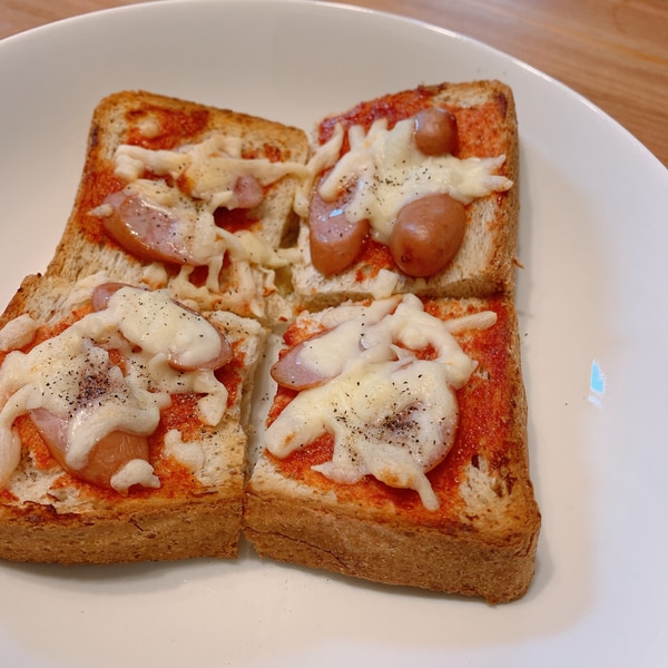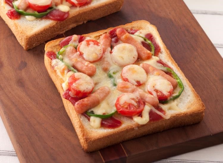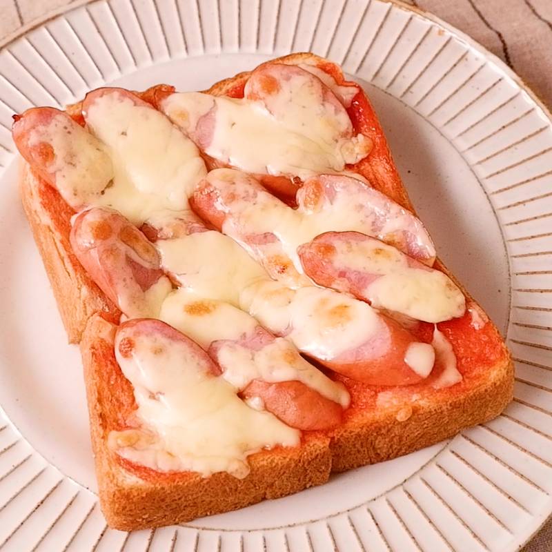 カリっと食感ピザトーストレシピ薄いサンドイッチ用パンを使用 ソーセージは“半割”で中まで熱々!のっけて、食べる。