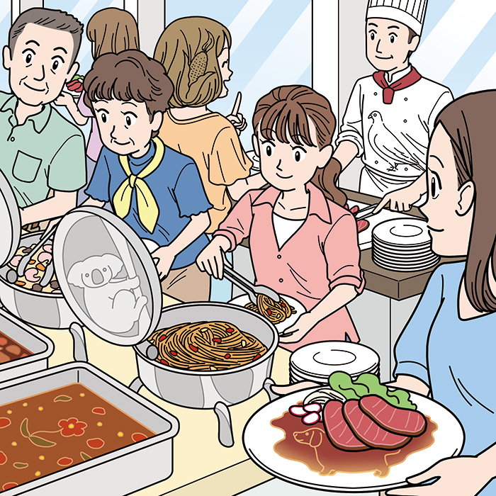 ホテルのブッフェでランチバイキングを楽しむ人々のイラスト かくし絵イラストレーター貴木まいこ。