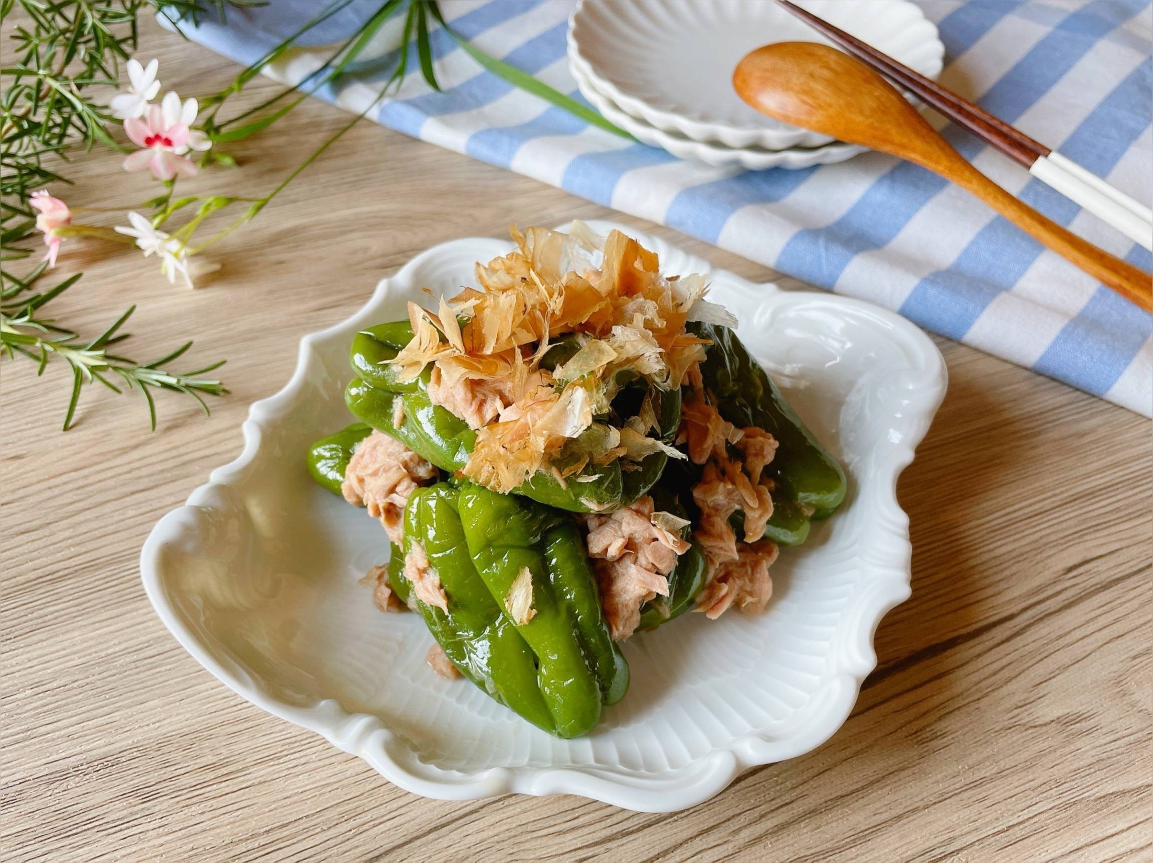 丸ごと無限ピーマン ,@sachiomeshiさんの投稿をご紹介します! , @sachiomeshi,美味しそう!作ってみたい!っと思った方はコメント欄に「✨」で教えて下さいね〜💓,*,材料 ,ピーマン 4〜5個, ◎ポン酢 大さじ1, ◎みりん 大さじ2, ◎しょうが 2cm, ・かつお節 適量,作り方 ,。