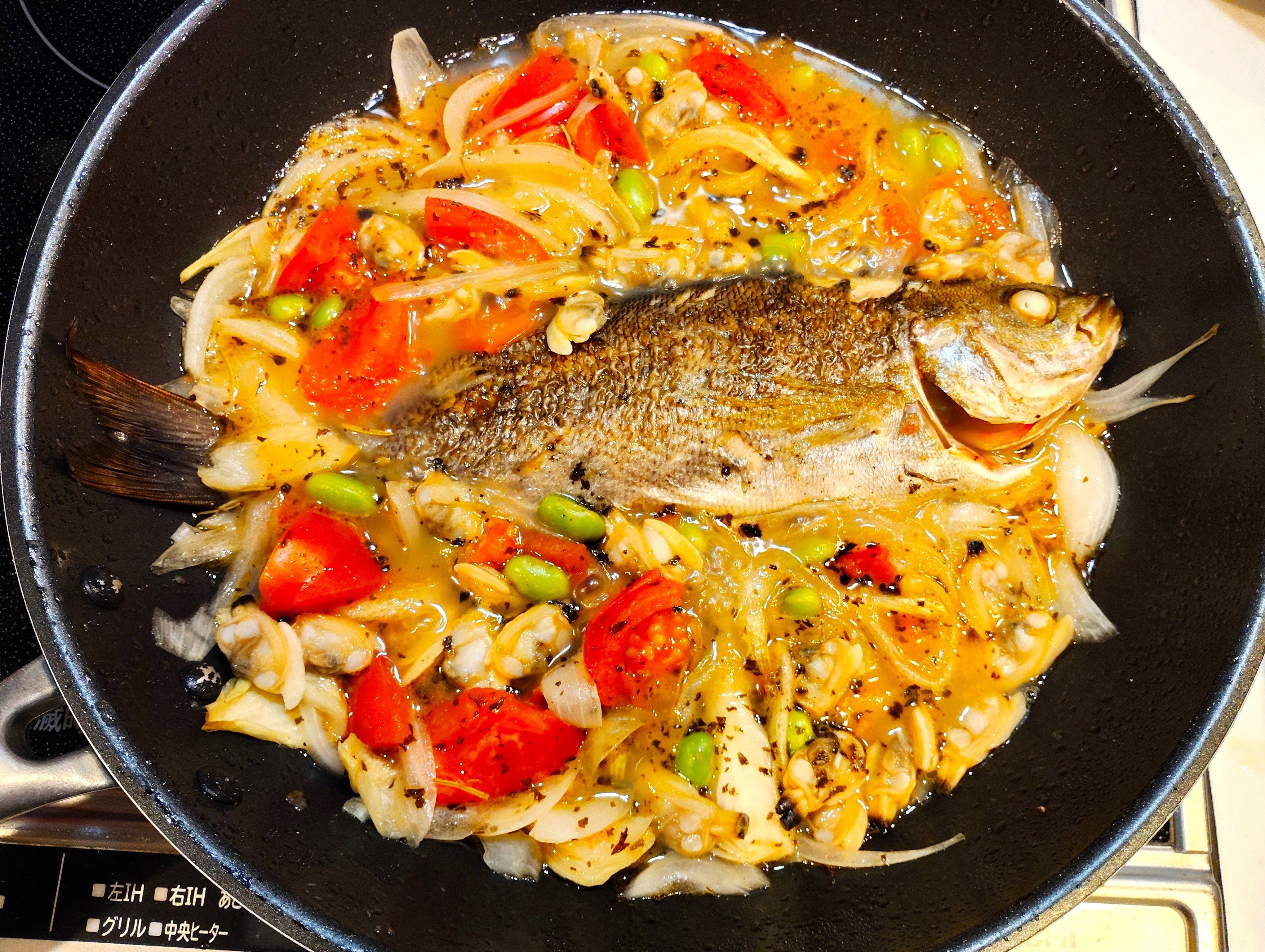 いやー美味かった!, イサキのアクアパッツァ🤤, 何年ぶりに作ったんやろ, 魚をフライパンで上手に焼く方法誰か教えてください🥹,イサキ、アサリの旨味とトマトの酸味や旨味, ちょっといい白ワインを水より多めに, アンチョビもまたいい味を出してくれる,イサキのフワフワした身と旨味爆弾スープの相性🤤, 後はちゃんとした焼き方覚えたらヤバいの完成しちゃいます。, 挑戦して良かった🤭,。