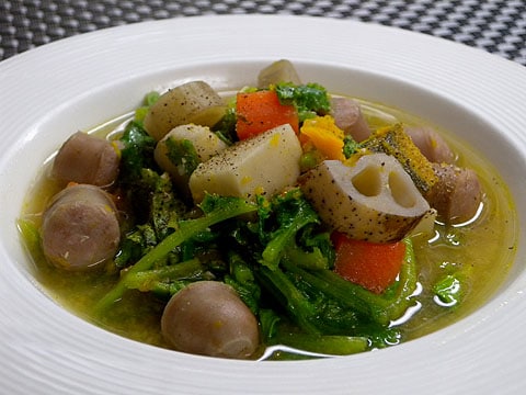 15、青菜と白菜のごまあえ、サワラの木の芽焼き 養父市。