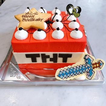 バースデーケーキに、マインクラフトTNTを立体形ケーキで大阪市東住吉区パティスリーデコ。