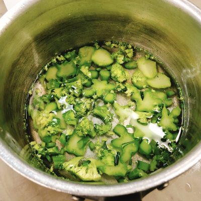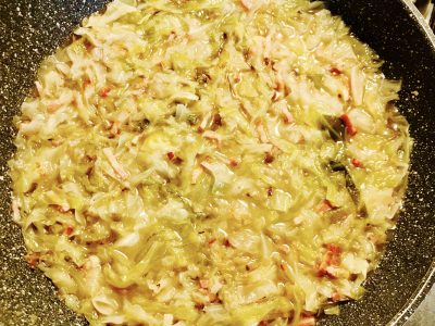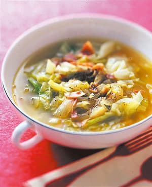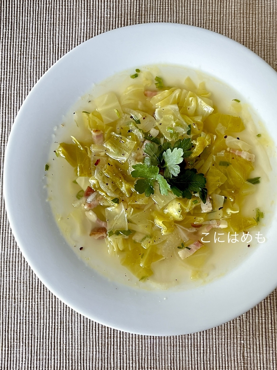 キャベツ、ベーコン、チーズのコンソメスープ。