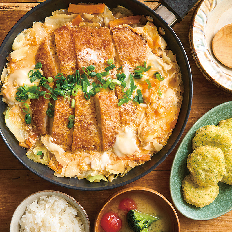 『4種野菜のカツ煮』、『国産長芋のり塩天ぷら』、ブロッコリーとミニトマトのみそ汁 3人分。