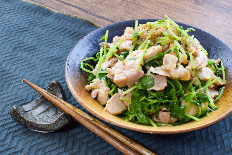鶏もも肉と豆苗のうま塩炒めレシピ。