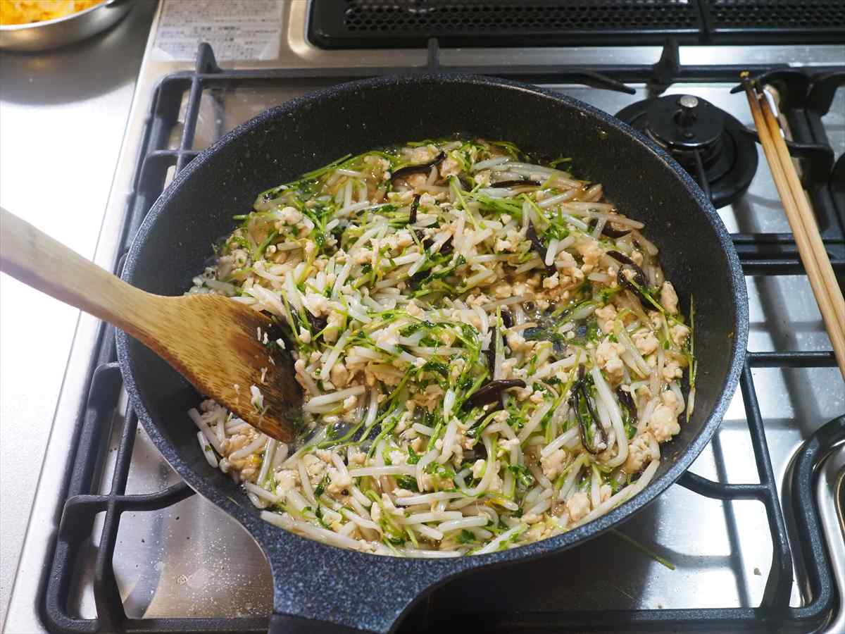 豆苗ともやしのふわとろ卵炒め<塩分控えめ>。
