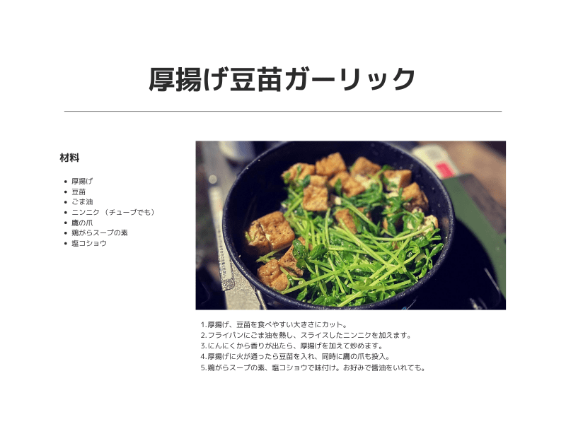 おつまみキャンプ飯レシピ 厚揚げ豆苗ガーリック- ゴールデンピッグ軽キャンピングカーレンタルショップ。