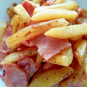 ハマごはん お手軽レシピon X: " 悪魔のポテサラジャーマンポテト①じゃがいもを一口サイズに切って水大さじ1を加えて600W5分温める②熱したフライパンにオリーブオイルを加えて中火でウインナー、じゃがいもを炒める ③コンソメ、ブラックペッパーを加えて。