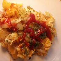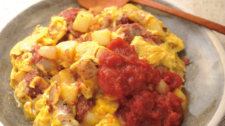 ジャーマンポテトの卵とじ熱々トマトソースがけ。