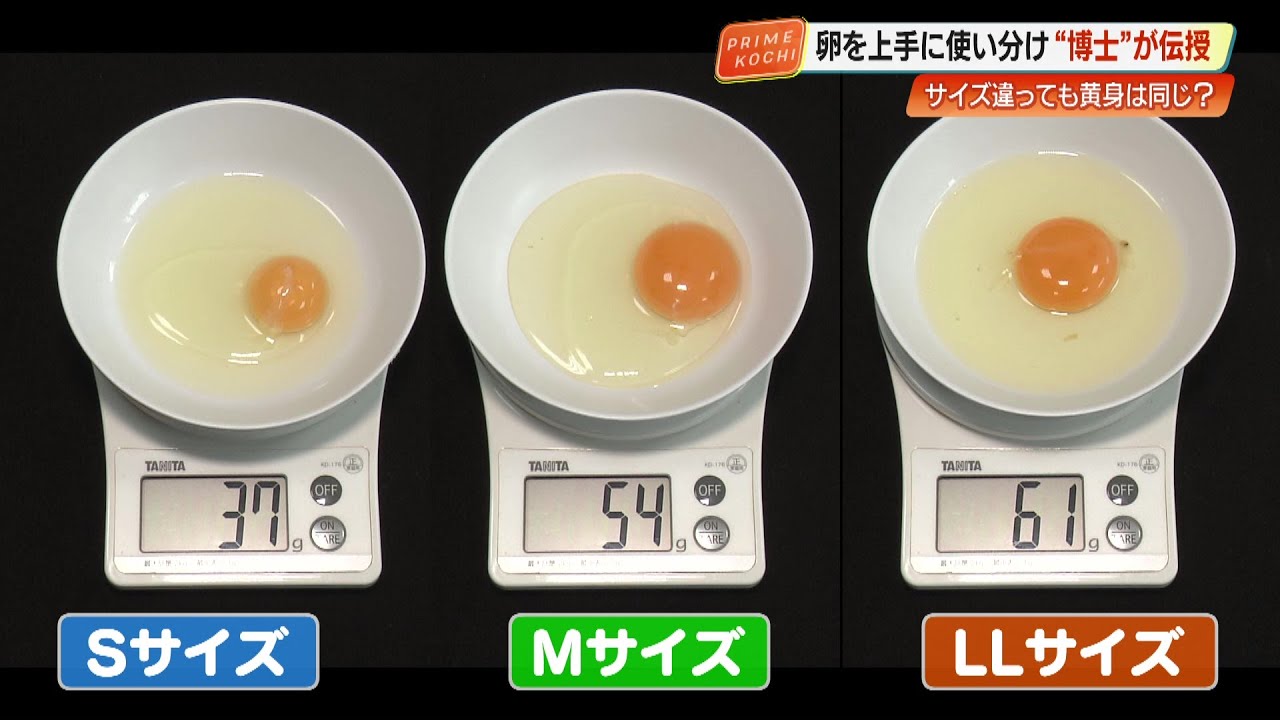 Mサイズ以上の卵は黄身の大きさ、ほぼ同じオムレツはM、お菓子作りにはLがおすすめ。