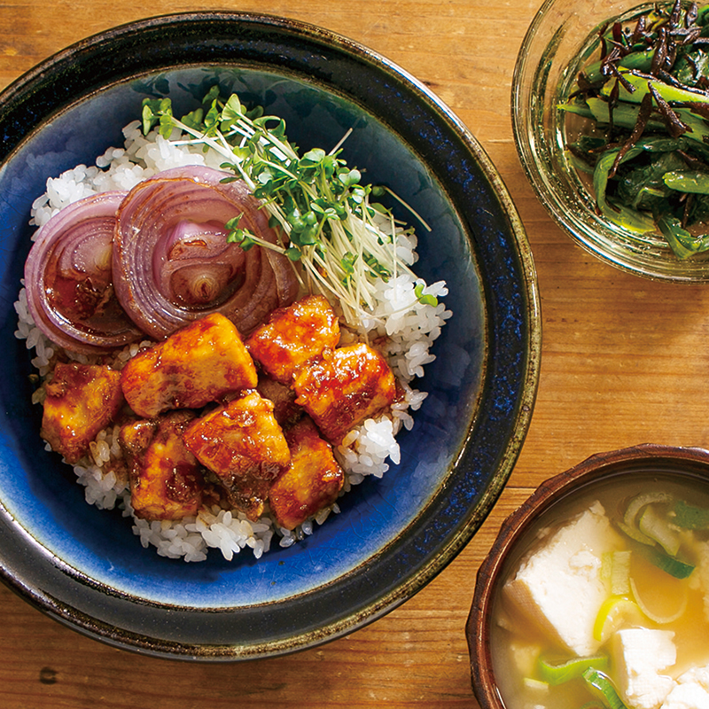 めかじきの照り焼きステーキ丼、ひじきと小松菜のサラダ、とうふのみそ汁 3人分 だいどこログ 生協パルシステムのレシピサイト。