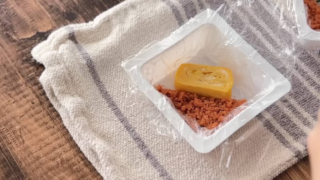 おにぎり弁当 SNSでバズった簡単おにぎらず 豆腐パック再利用 市販の冷凍食品使用。