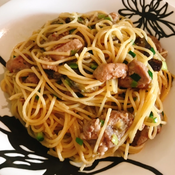 ワンパンで簡単!豚こまとねぎの和風パスタ。