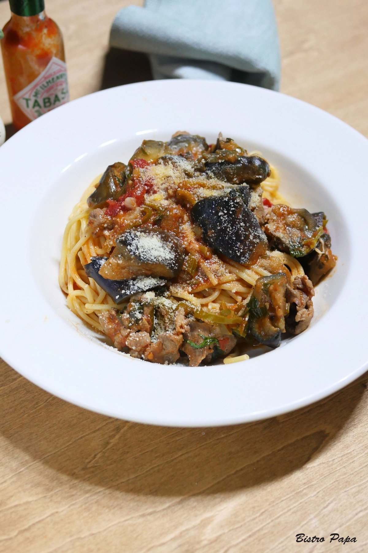 和えずに簡単かけるだけ!ナスと豚ロースのチーズたっぷりがっつり トマトソースパスタレシピ- シェフキヨの本格イタリアンレシピ -簡単おうち料理ガイド。