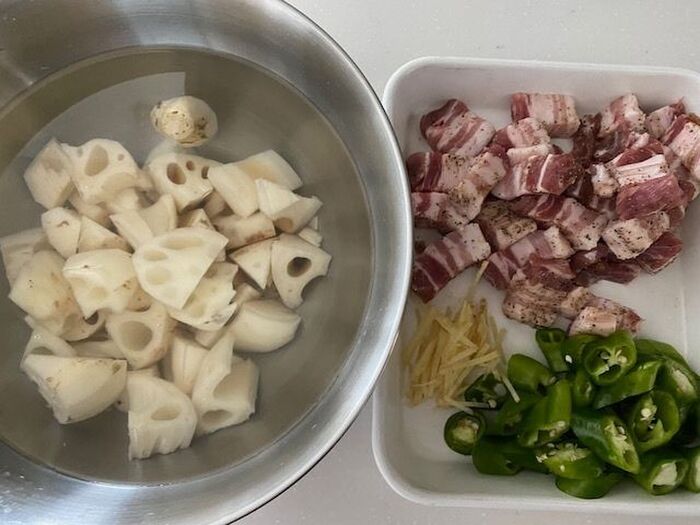 しょうがたっぷり〜シャキシャキれんこんと豚バラ肉の炒め煮。