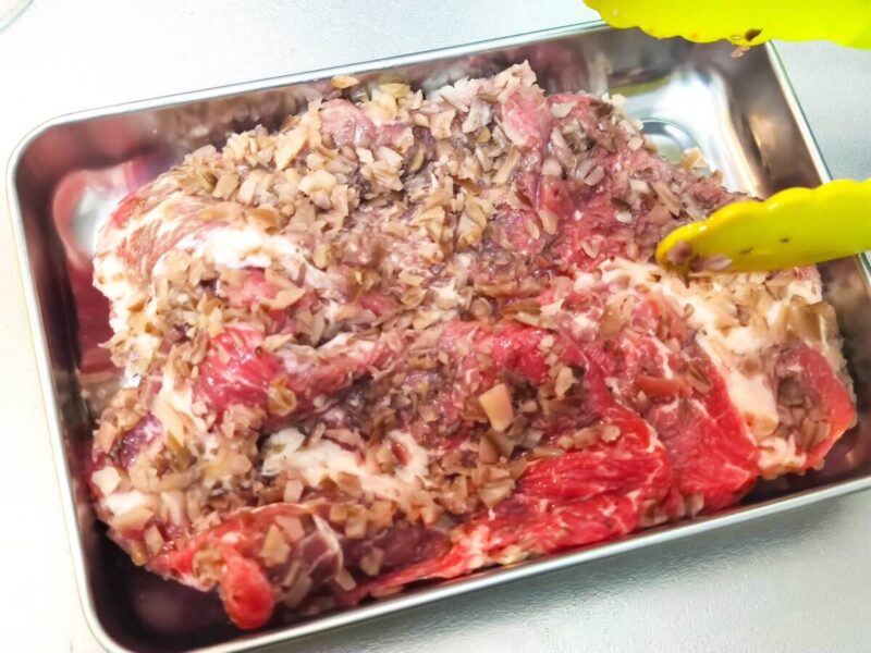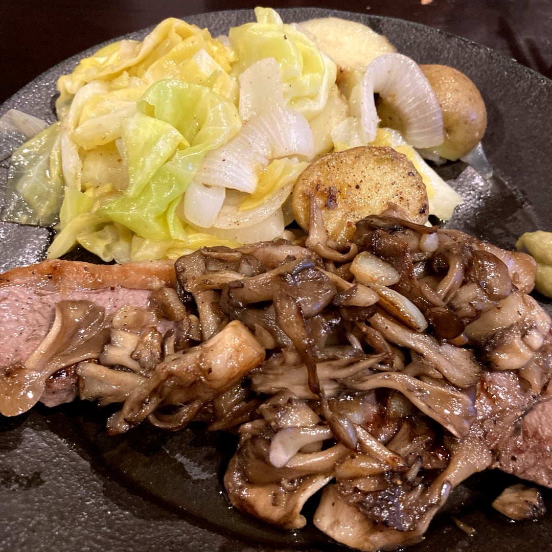 マイタケ最強説 舞茸で漬けたステーキが柔らかくてめっちゃ美味い。