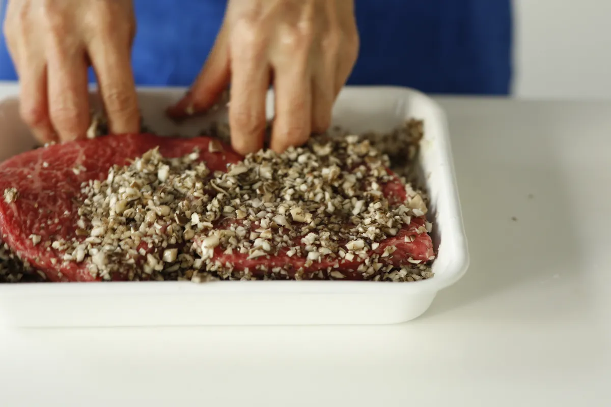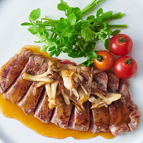まいたけ下味冷凍 きのこの旨味しっとり牛肉ステーキ肉。
