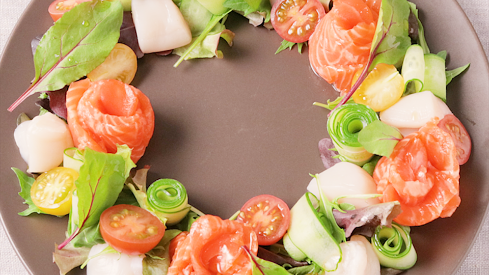 クリスマスレシピ≫サーモンとほたてのリースサラダスタジオウィッシュ京都の料理撮影スタジオ。