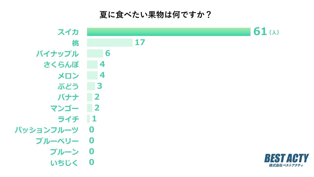 アンケート調査 夏に食べたい果物は?程よい甘みと食感が魅力の「スイカ」が1位。暑い日には凍らせて食べる人も株式会社ベストアクティのプレスリリース。
