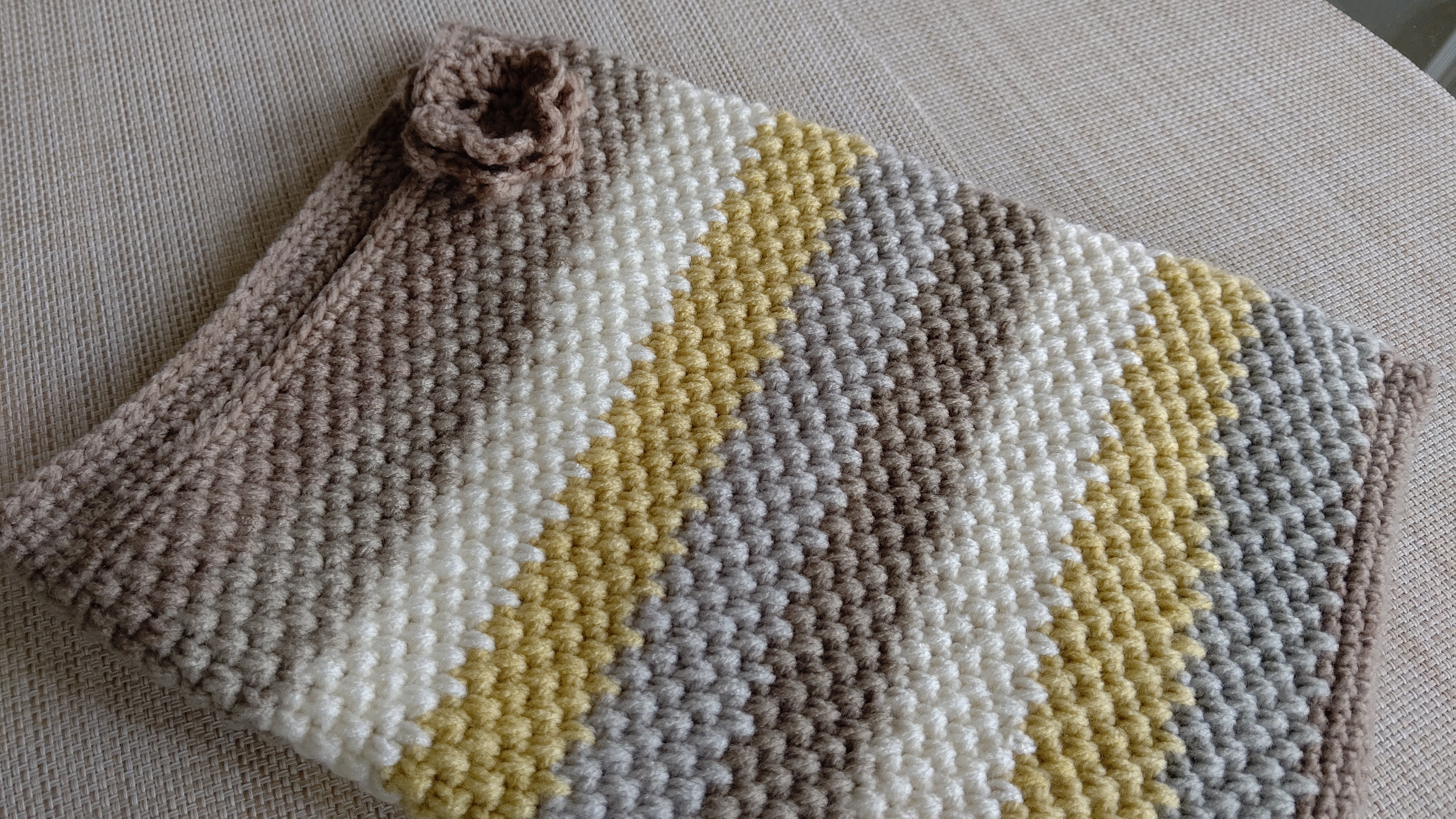 ダイソーのパティシエを3色、1玉ずつ組み合わせてみました😊, 動画▶「パティシエ3色組み合わせたら可愛くひざ掛けが編めました。」,モコタロウモコタロウ作品編み物かぎ針編みハンドメイドcrochet。