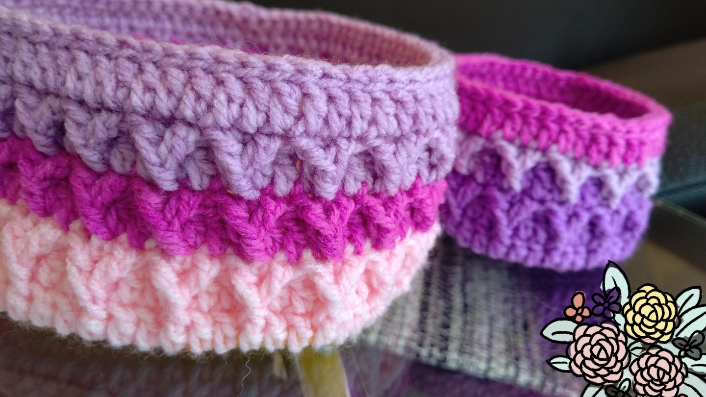 DAISOさんの200円毛糸パティシエ1玉で大小ふたつのカゴ。