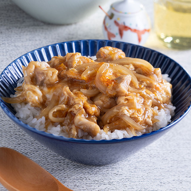 レンジでとろとろ親子丼<材料 1人分 > 鶏もも肉 80g 玉ねぎ 25g 砂糖 小さじ1 めんつゆ 濃縮2倍大さじ3 水 大さじ4 卵 2個ご飯 適量 みつば 適量 <作り方> 1.玉ねぎは薄切りにし、鶏肉は2cm角に切って耐熱容器に入れ、砂糖、めんつゆ、分量の水を加え。