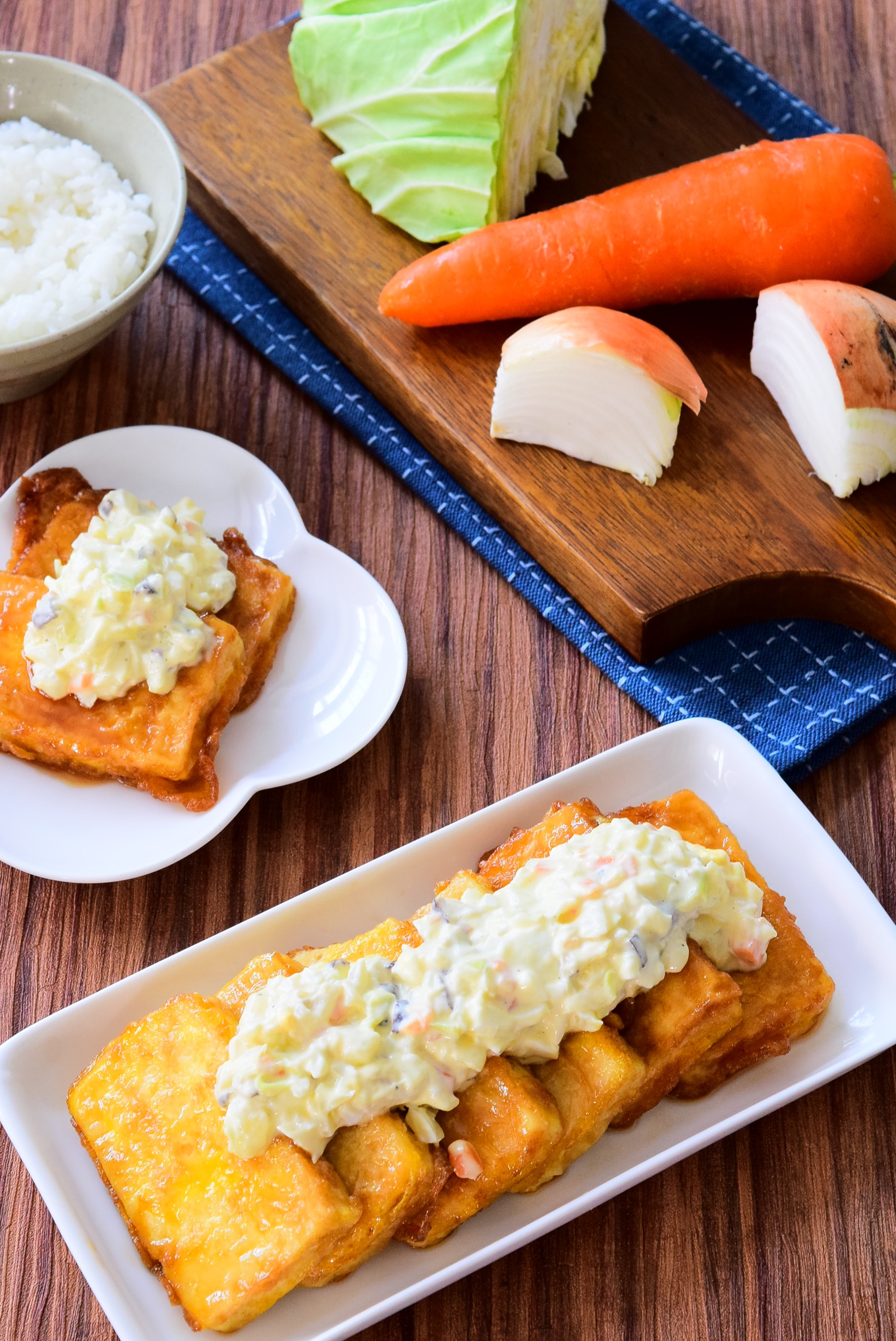 野菜たっぷりタルタルソースがけ豆腐のチキン南蛮風のレシピ。