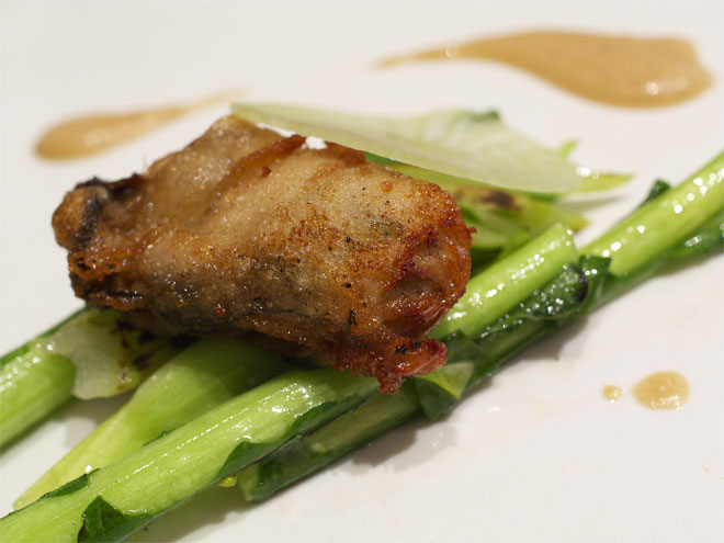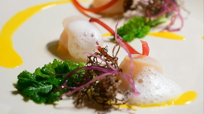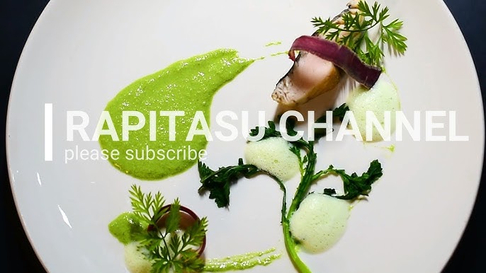 鰆のロティ フランス料理 春菊のクーリと宇治抹茶の泡を添えて - YouTube。