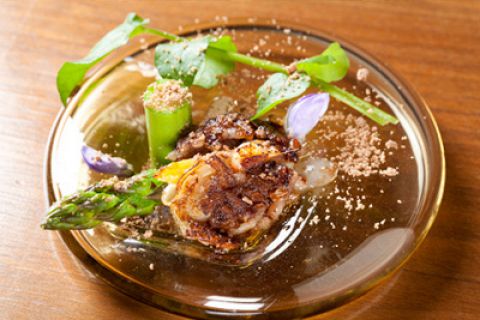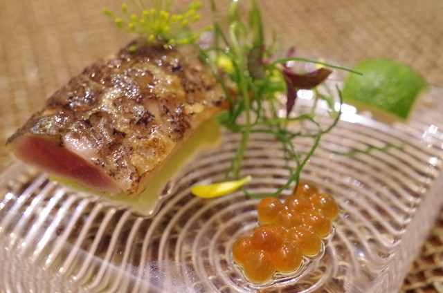 甘鯛の鱗焼き 新玉ねぎのクーリ - 吟天シェフ酒。