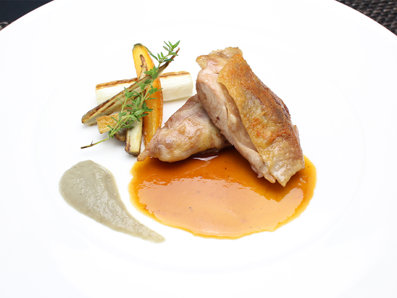 チキンのコンフィ ~ゴボウのクーリ&ソースヴォライユ添え~レシピ業務用スープと業務用フォンドヴォーのキスコフーズ株式会社 KISCO。