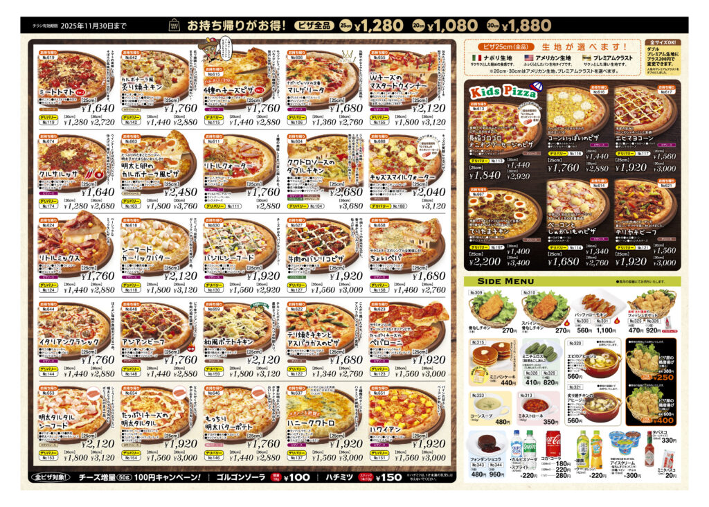 こちらがメニューとなります! 11月期間限定で、海老グラタンピザオススメしております❕💕💕ほぼ全てのピザ1000円以内でお買い求めいただけます🍕 クリスピーチキン、特製鶏からも大人気です🐔毎月28日は『ニワトリの日』Wチーズが無料❗️そしてチキンバスケット類は2。