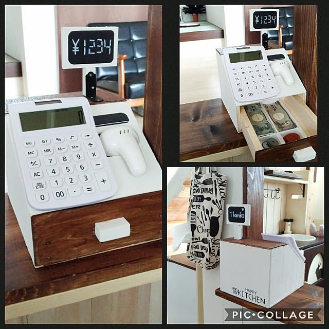 スキャンやレジ打ちもできる!100均材料だけ!レジスターDIY, ., これいいな!って思ったら、右上の「保存」ボタンを押してね🤗, .,お店屋さんごっこに欠かせないレジスター!, 買うと意外と高いですよね💦, 実は100均の材料だけで本格的なレジスターが作れます!, ., ■材料,・木製デスクラック 3ポケット セリア, ・ディスプレイバー ウッドピン セリア,。