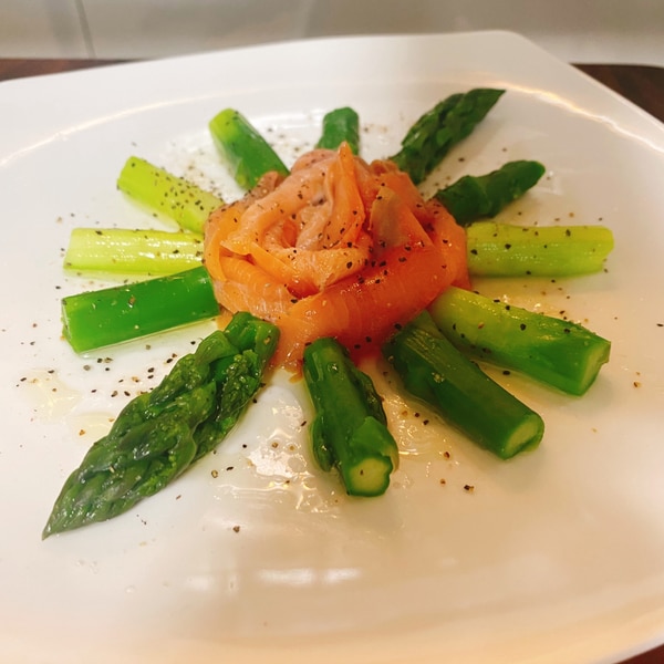 スモークサーモンとアスパラの前菜。