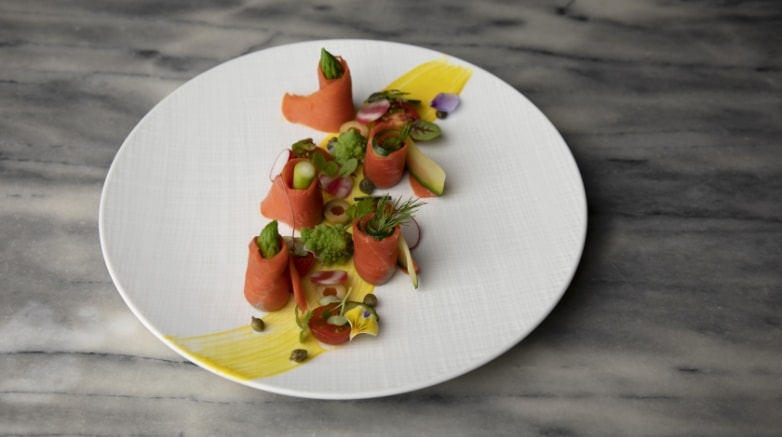 スモークサーモンのルーロー 彩り野菜とともに。