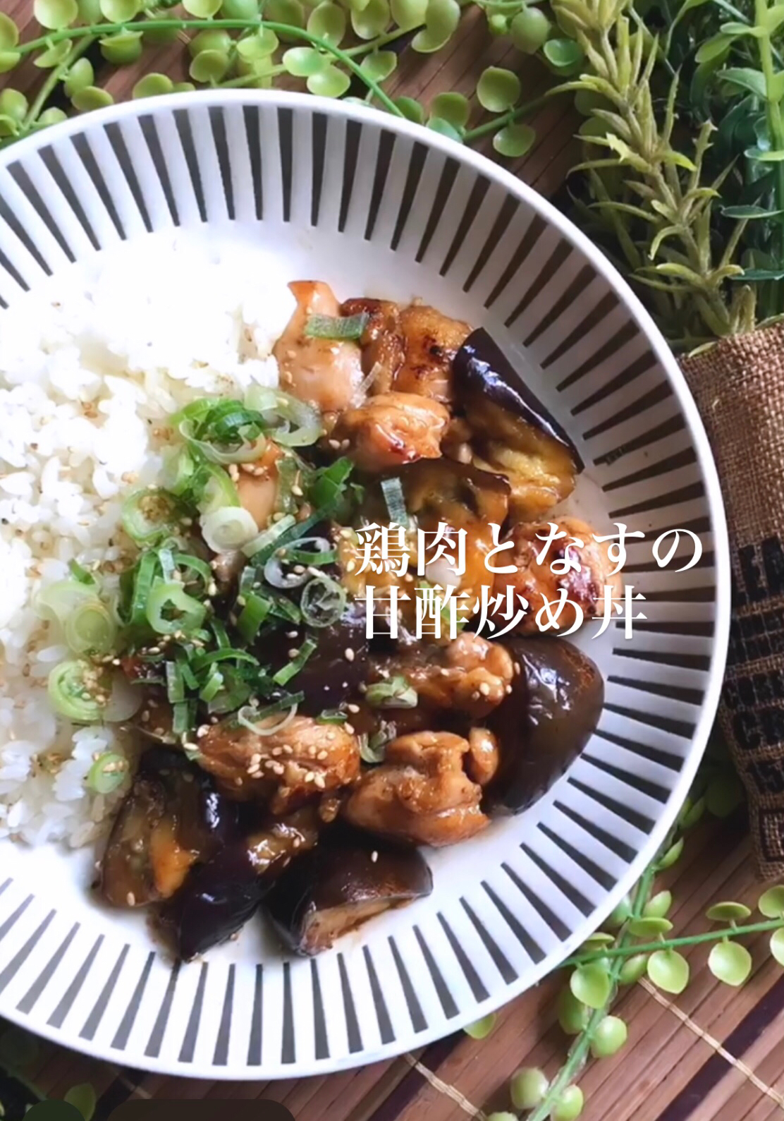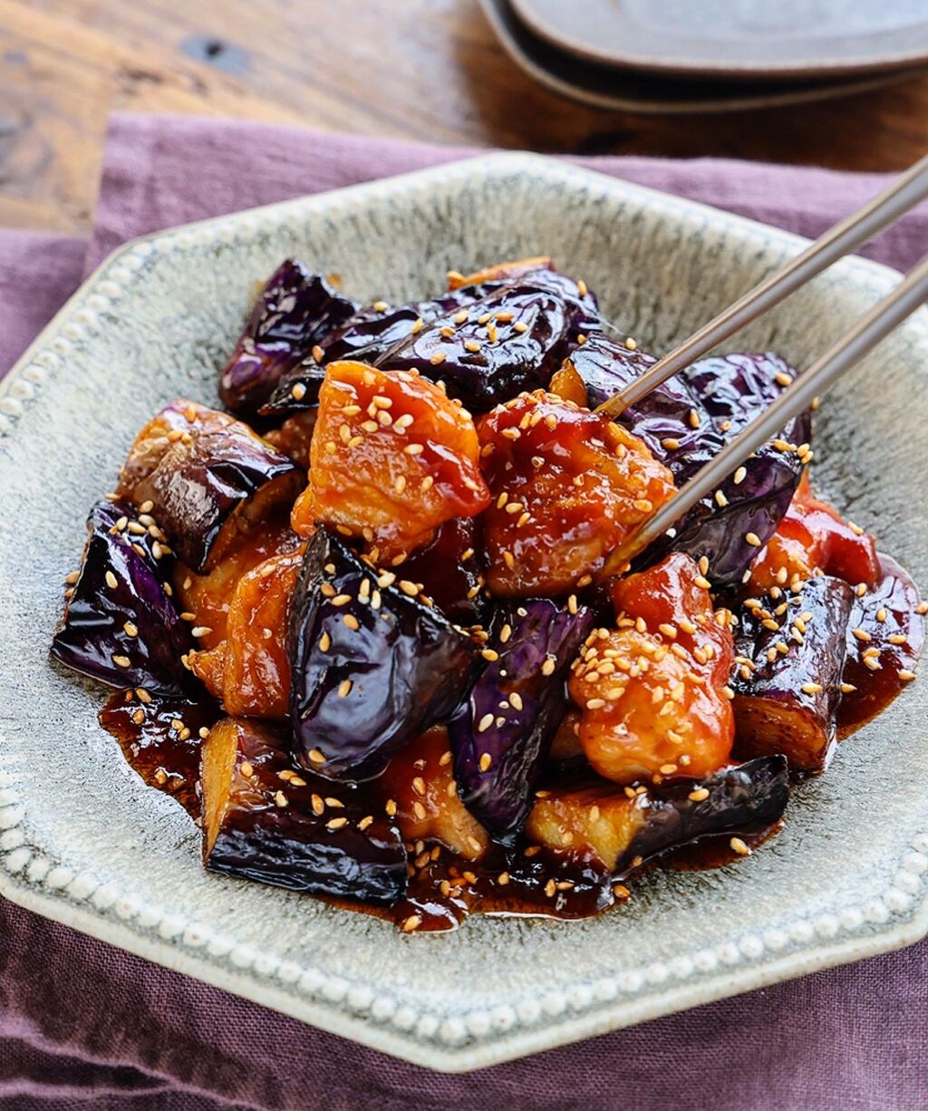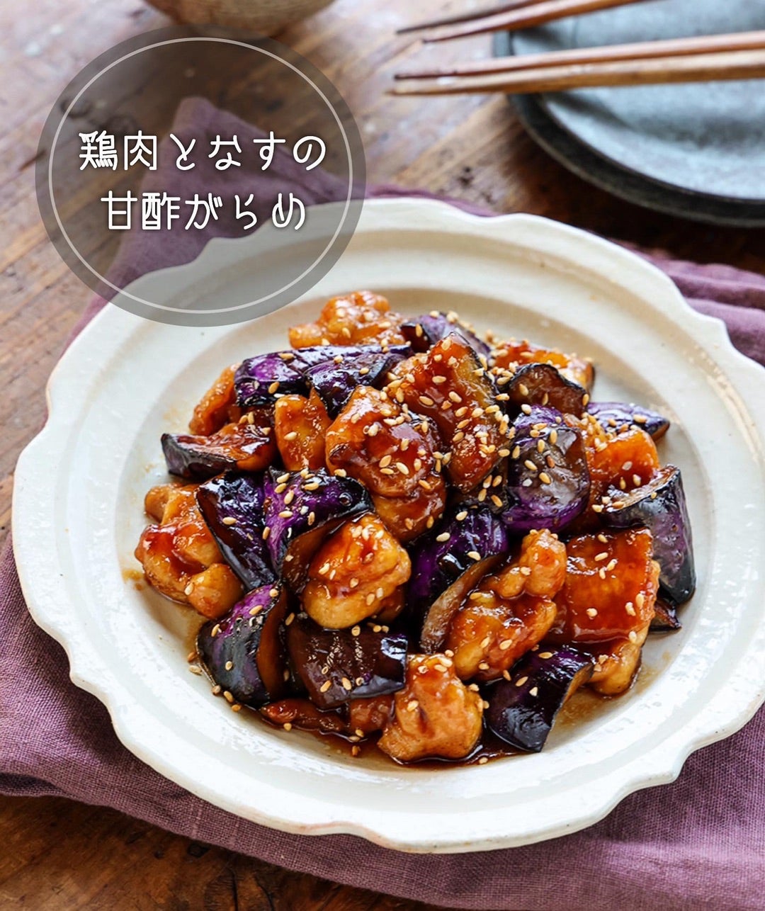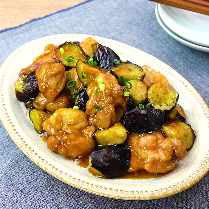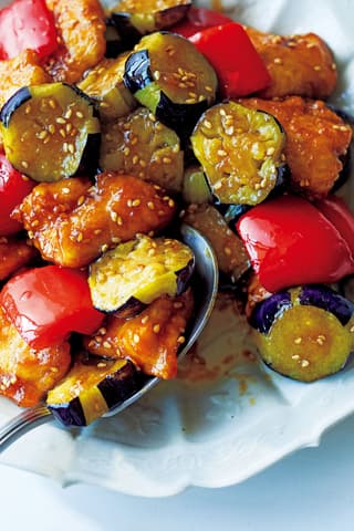 鶏肉となすの甘酢がらめ。