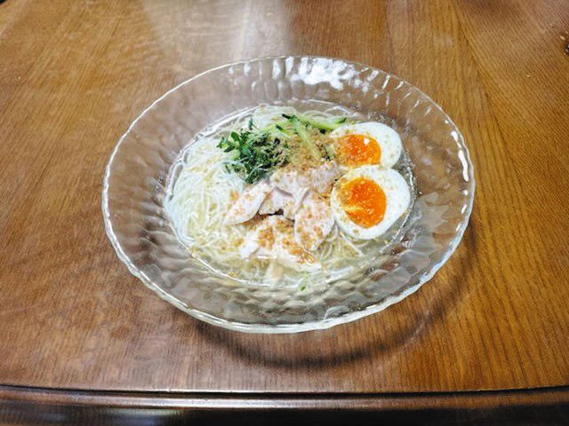 レモンそうめん🍋 暑い日に涼を感じる一杯です🎐 上には、手作り茹で鶏とオクラを乗せました。 市販のサラダチキンでも、もちろんOK!豚しゃぶを乗せたり、 ミョウガを刻んで乗せたり、 お好きな具材で作ってみてください♪ ✏︎レシピ⬇︎ 〜あっさりレモンそうめん。