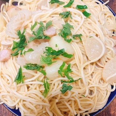 おでんの残り汁で!ジョンソンヴィルとネギのパスタ。