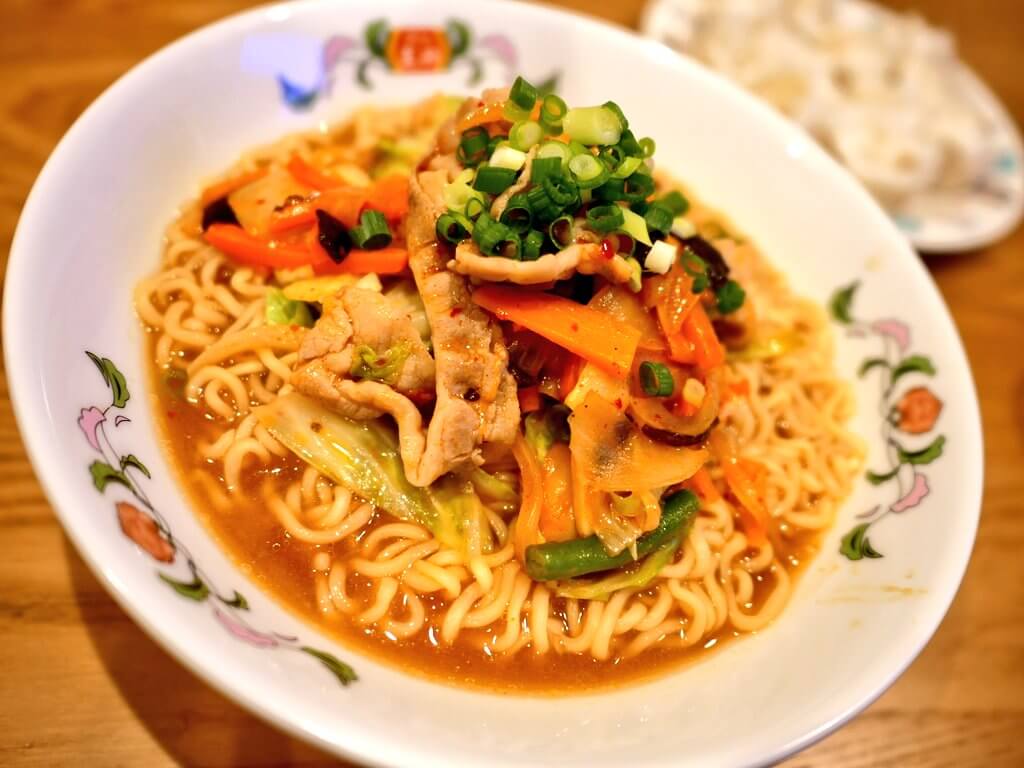 サッポロ一番みそラーメンで作る豚キムチ野菜みそラーメン。