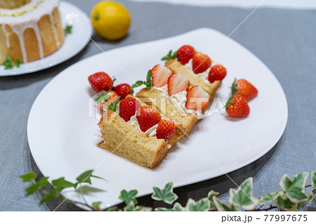 白いお皿に盛り付けられた苺のシフォンケーキサンドの写真素材77997675- PIXTA。