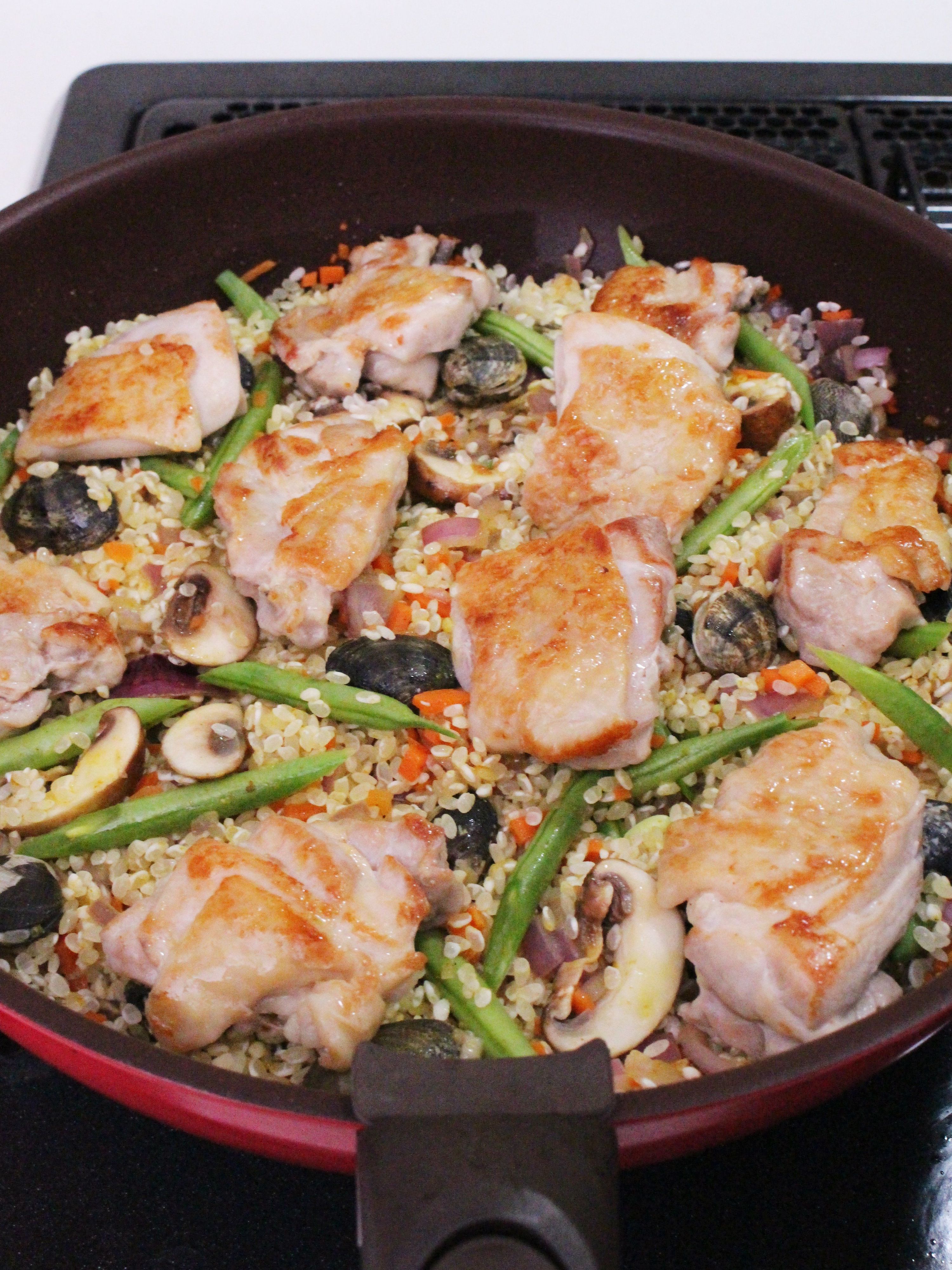 フライパンでお手軽*ガッツリ鶏肉のカレー風味パエリア♡。