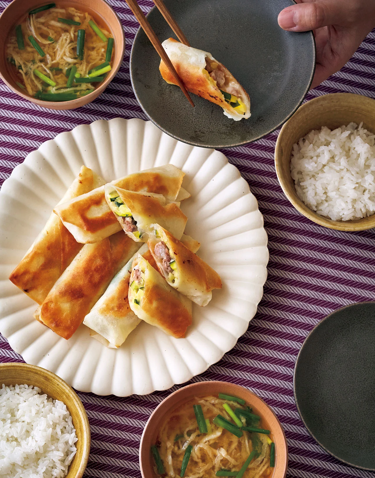「豚こまとズッキーニのチーズ春巻き」の献立。