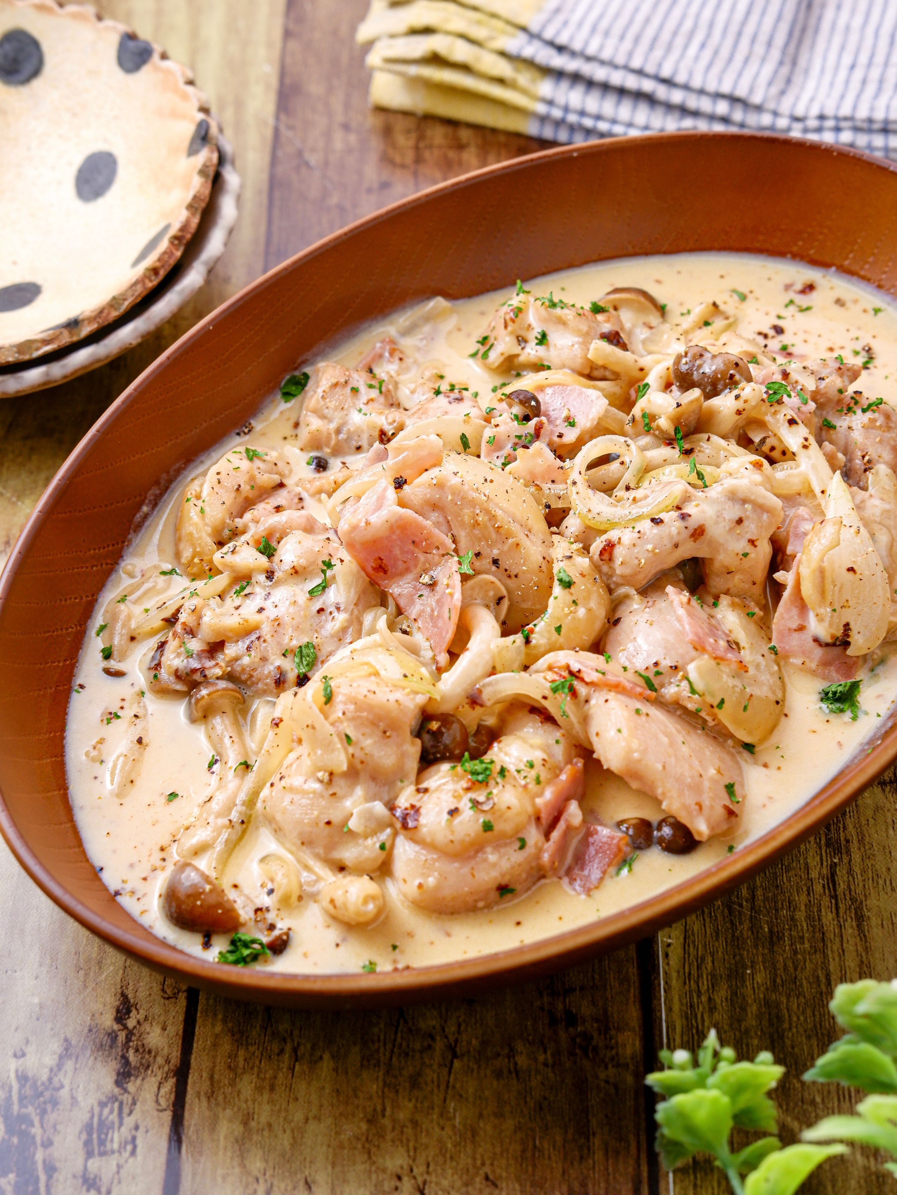 カルボナーラチキン 夫も絶賛!絶品クリーム煮アレンジ♬。