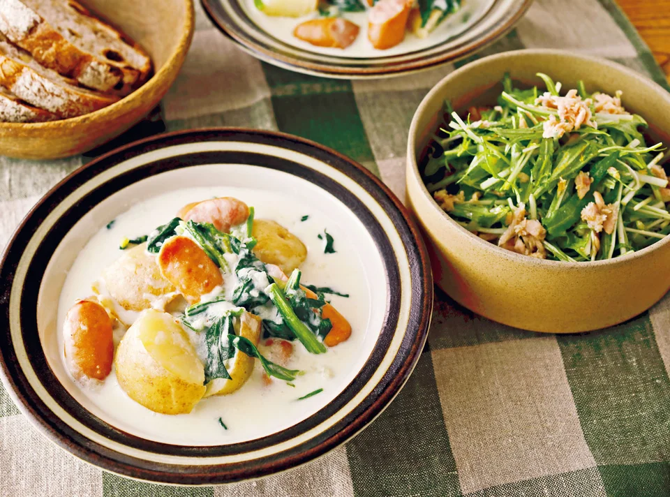「ソーセージとほうれん草のクリームシチュー」の献立。