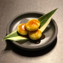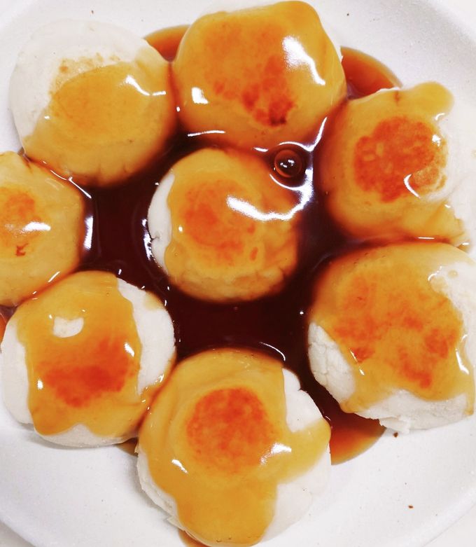 チーズ入りさつまいも餅のみたらしあんかけ。
