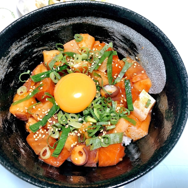 本格的な海鮮ユッケ丼 サーモン、たこ、ぶり。