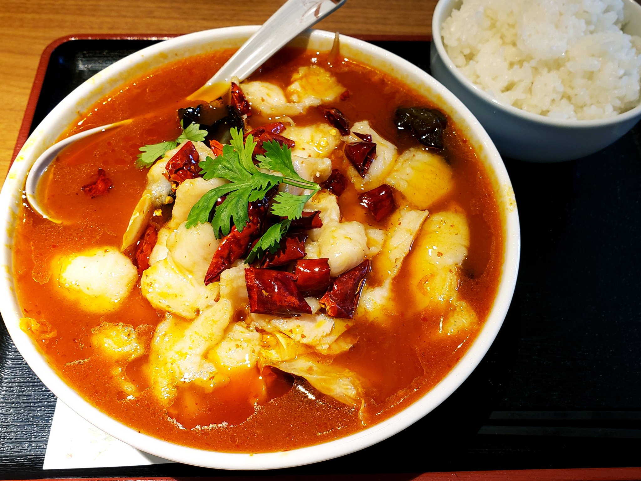 水煮魚 スェイツーユィ をご存じですか?麻婆豆腐と双璧をなす中国四川料理、辛い揚げ魚の料理。白身魚と野菜の激辛煮込みを食べてきました🔥個人的には辛さはメニュー名ほどではなかったです。辛くて美味しい。特に油が嫌いじゃない人へおすすめです。揚げた白身魚を。