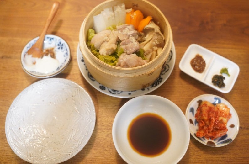 塩麴で鶏をもみ込み1時間。「鶏と野菜のせいろ蒸し、青ねぎだれ」のレシピ。