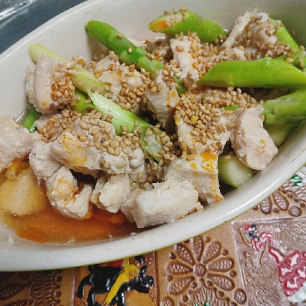 鶏むね肉の醤油麹漬けとアスパラの電子レンジ蒸し。