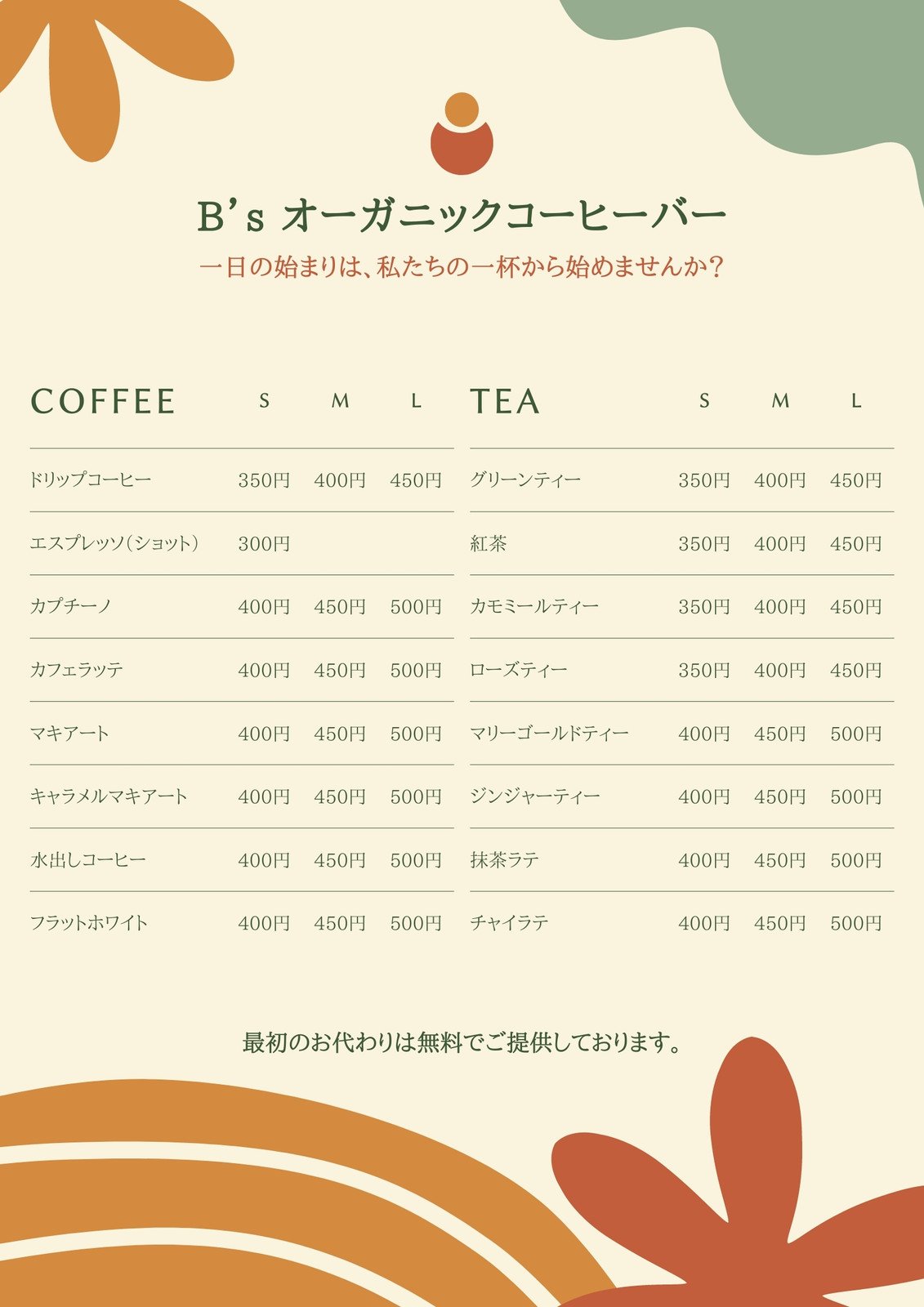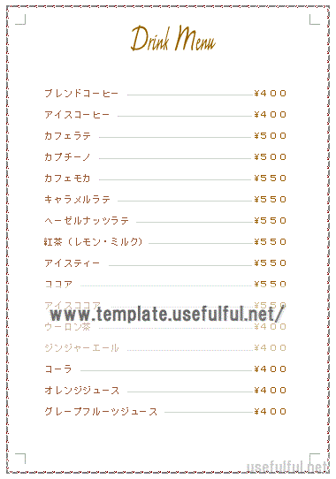 飲み物のメニュー表テンプレート・Word無料のビジネス書式テンプレート。