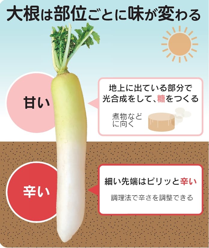 クックパッドニュース:甘いのはどこ?大根の「部位別」特徴を野菜博士・緒方湊くんが解説毎日新聞。
